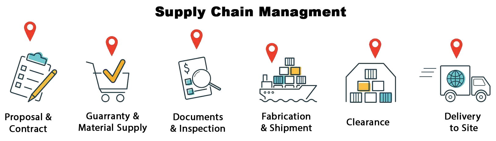 ما فرآیند کامل مدیریت زنجیره تامین کالا از تهیه مدارک شرکت در مناقصه، ارائه پیشنهاد فنی و مالی، ارائه ضمانتنامه ها، عقد قرارداد، تامین مواد اولیه و خام، مدیریت و تهیه مدارک مهندسی و بازرسی، پیگیری و هماهنگی ساخت، کنترل کیفیت و بازرسی کالا، بسته بندی و حمل، ترخیص کالا و تحویل کالا به سایت را به صورت جامع و کامل مدیریت می کنیم.